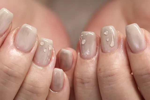 まるで爪の上に水滴が乗っているかのような、みずみずしいデザインです。アート用の細い筆の先端にクリアジェルを取り、爪の上にポツンと垂らすように置いてライトで硬化させるだけで完成です。