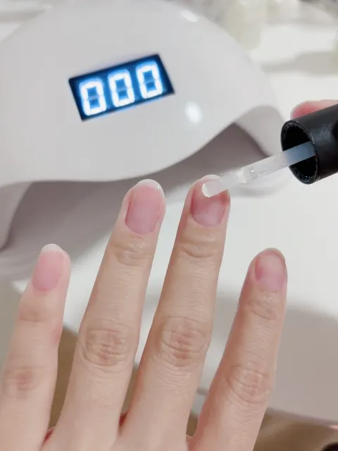ベースジェルが硬化したら、トップジェルを塗ります。クリアネイルの魅力である「ぷっくり感」と「ツヤ」を出すための仕上げの工程です。ベースジェルよりも少し多めにジェルを取り、爪の中央にのせてから全体に広げるように塗ると、きれいなフォルムが作りやすくなります。塗り終えたら、再度ライトに入れて完全に硬化させましょう。