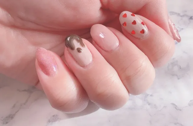 「あまり派手なネイルはできないけれど、バレンタイン気分は味わいたい」という方には、ベージュやグレージュがおすすめです。肌なじみがよく、指先をきれいに見せる万能カラーです。小さなハートのホログラムをちりばめたり、1本だけブラウンのワンカラーを入れるとバレンタインらしさが引き立ちます。上品で控えめながらも、細部におしゃれ心を宿したデザインです。