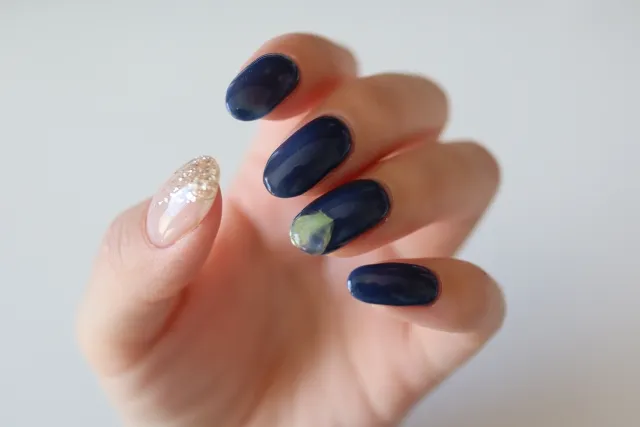 苦手な色をネイルのメインカラーにするのではなく、デザインの一部として取り入れてみましょう。例えば、ベースは得意なベージュにして、青色のストーンを一粒乗せたり、細いラインで入れたりする方法があります。