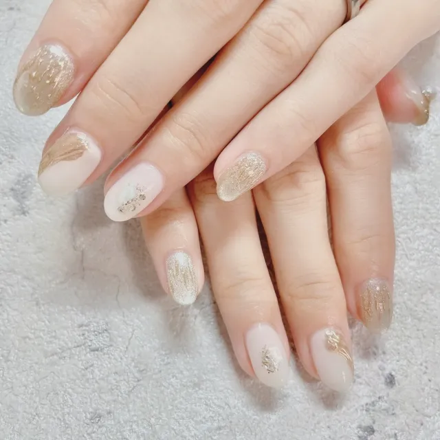 決まった形にとらわれず、色を滲ませたり混ぜたりして作るニュアンスネイル。イエベ春さんが取り入れるなら、暖色系をベースに、乳白色やゴールドを混ぜた「もやもやネイル」がおすすめです。