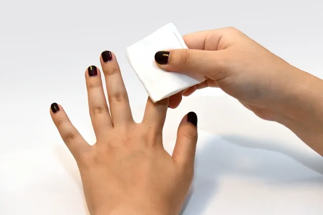 具体的な処置の手順としては、まずウッドスティックの先端を使って、皮膚についたジェルをていねいに拭き取ります。その後、エタノールや専用のクリーナーを染み込ませたコットンで、患部をやさしく拭き上げてください。