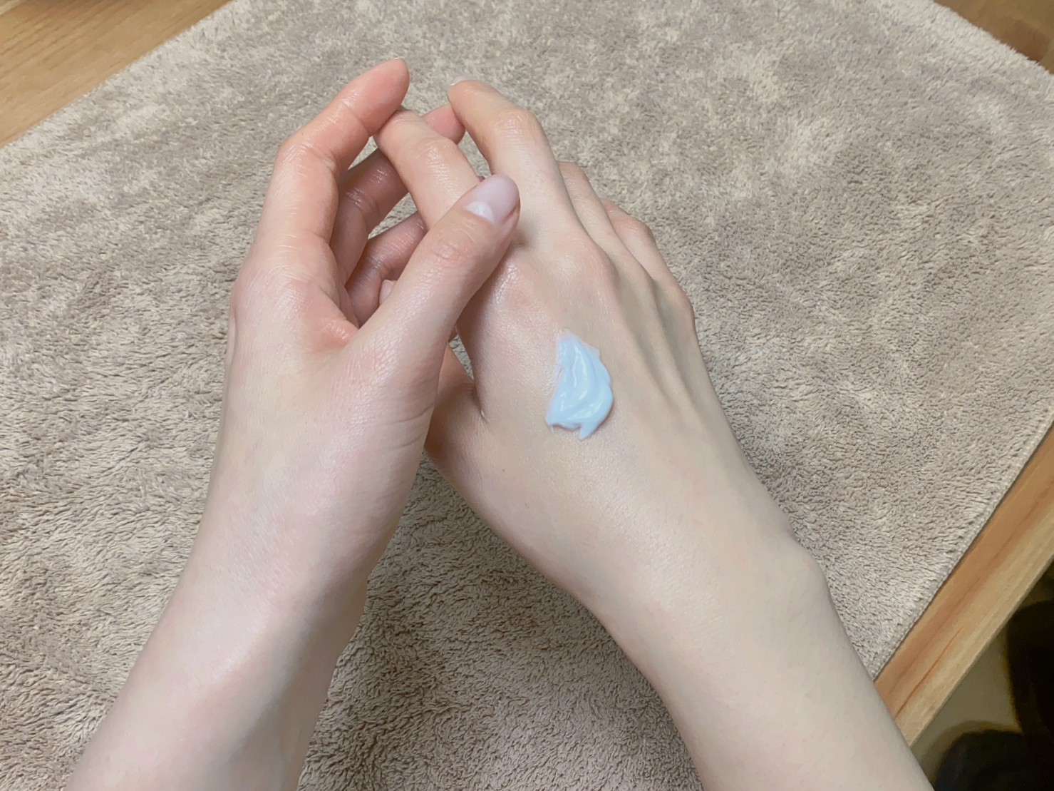 クリームを多めに手に取り、手首から指先にかけて血流を流すようなイメージで揉みほぐします。ハンドクリームでもボディクリームでも、どちらでもかまいません。やさしい力で、ていねいに行います。